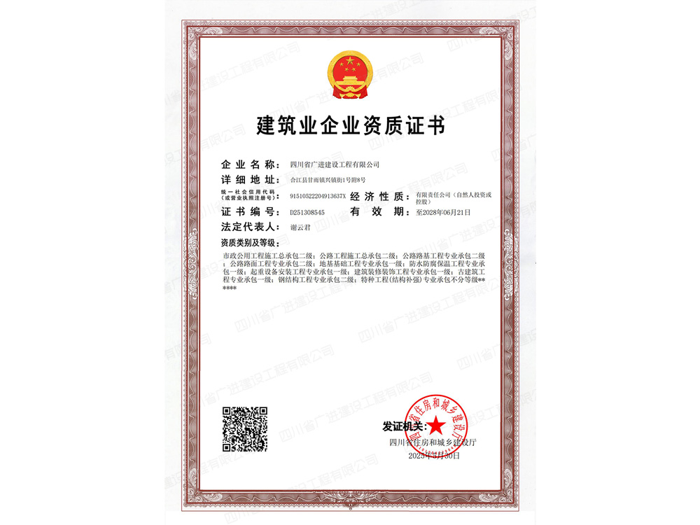 目前,公司建筑工程施工總承包資質(zhì)已升級為壹級資質(zhì),公司有職工280余人,有職稱人員113人(其中高級職稱3人、中級職稱32人、初級職稱78人);各類管理上崗人員40余人;大中專學(xué)歷85余人;高中專學(xué)歷120余人。企業(yè)法人代表兼總經(jīng)理:謝云君,注冊資金壹億伍仟萬元,下面設(shè)有一個(gè)分公司“四川省廣進(jìn)建設(shè)工程有限公司赤水分公司”,分公司地址:貴州省遵義市赤水市太平街。